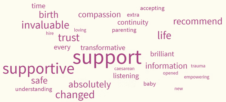 Wonderful experience. My doula helped me believe in myself. She was reassuring, calm, wise and loving. The birth was a positive, empowering experience.